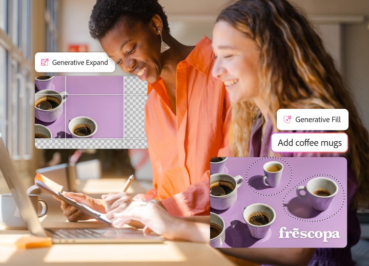 Bilder von Kaffeetassen, erstellt mit den Funktionen „Generatives Erweitern“ und „Generatives Füllen“.