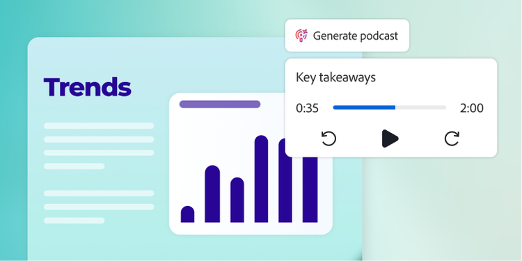 El Asistente de IA de Adobe Acrobat ayuda a analizar informes y documentos de rendimiento mediante IA conversacional. Genera resúmenes, extrae conclusiones y crea cómodos resúmenes de audio para diseñar los mensajes, la estrategia y la dirección del contenido, de modo que los equipos puedan entender qué es lo más importante.