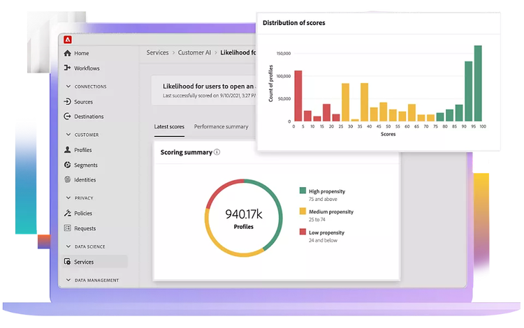 Desde las campañas por correo electrónico hasta las encuestas en redes sociales, la información predictiva de Adobe posibilita el diseño de recorridos integrales basados en los comportamientos y preferencias de interacción de clientes. La inteligencia artificial te ayuda a buscar y segmentar clientes con un alto valor, retener a los ya existentes y optimizar la oferta de experiencia para mejorar el ROI de las campañas.