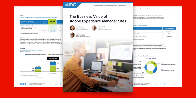 Lee este estudio de IDC, basado en una serie de entrevistas en profundidad y una metodología especializada de valor empresarial, para descubrir cómo Experience Manager Sites contribuye a: