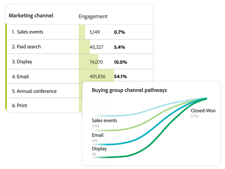 - Brinda a ventas y marketing la capacidad de analizar la interacción en cada nivel, incluido el responsable de departamento individual, grupo de compra, oportunidad y nivel de cuenta, para descubrir qué impulsa el progreso, dónde se estancan las oportunidades y cómo optimizar la estrategia de ingresos.