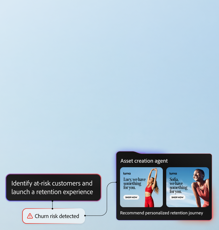 Grâce à l'IA Adobe, unifiez l'ensemble de vos données, votre contenu et vos workflows, gagnez en efficacité et offrez des expériences à grande échelle personnalisées et à fort impact.