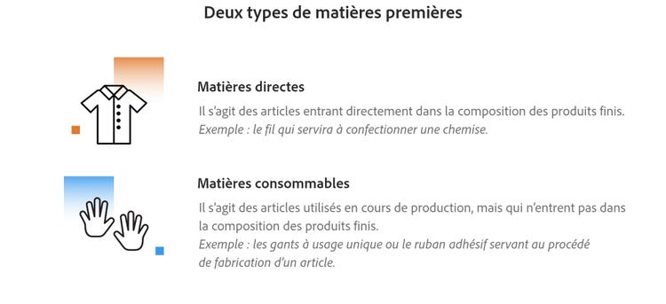 - Matières directes. Il s’agit des articles entrant directement dans la composition des produits finis (par exemple, le fil qui servira à confectionner une chemise).
