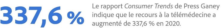 Patienter en salle d’attente peut être contraignant pour quelqu’un qui ne se sent pas bien, s’inquiète pour un proche ou reçoit des conseils douteux et dévalorisants. Avec la télémédecine, plus besoin de se rendre en cabinet. Il est possible d’obtenir une consultation médicale en restant chez soi. La patientèle est prête à utiliser cette technologie : le rapport Consumer Trends de Press Ganey indique que le recours à la télémédecine a augmenté de 337,6 % en 2020.
