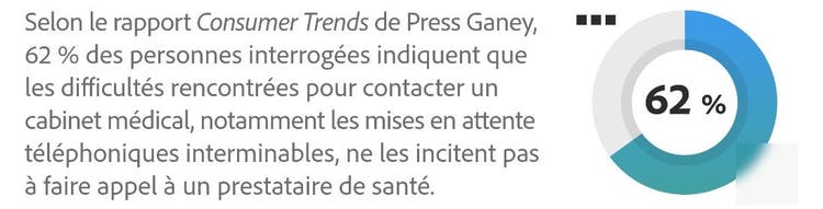 L’une des principales plaintes que les patients formulent au sujet des prestataires de santé concerne les temps d’attente. Selon le rapport Consumer Trends de Press Ganey, 62 % des personnes interrogées indiquent que les difficultés rencontrées pour contacter un cabinet médical, notamment les mises en attente téléphoniques interminables, ne les incitent pas à faire appel à un prestataire de santé.