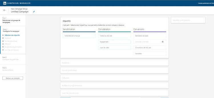 LinkedIn a inclus une zone « Résultats prévisionnels » dans la partie droite de l’écran pour vous donner un aperçu des résultats que vos sélections produiront et du coût potentiel de votre publicité. Utilisez-la pour déterminer si le type de publicité correspond à votre campagne et votre budget. Les prévisions s’actualisent automatiquement lorsque vous modifiez des paramètres tels que l’objectif, l’audience et le format publicitaire.