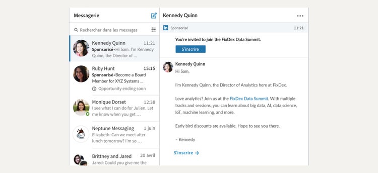 - Les messages publicitaires sont envoyés comme des messages classiques et placés dans la boîte de réception LinkedIn de l’utilisateur ou utilisatrice.
