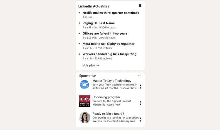 Les publicités Text Ads LinkedIn apparaissent en haut ou en bas à droite de l’écran, généralement sous la section « LinkedIn Actualités ». Elles sont généralement plus courtes que les contenus publicitaires sponsorisés, mais se distinguent plus nettement dans le fil LinkedIn principal, car elles sont conçues pour vous aider à développer la notoriété de votre marque.