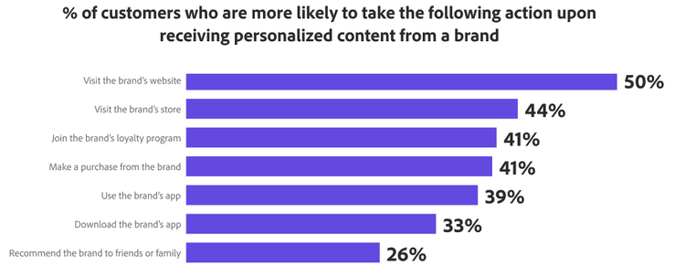 La personnalisation des e-mails n’est pas un phénomène nouveau. Depuis des années, les spécialistes marketing savent qu’elle stimule la réceptivité et la probabilité d’engagement de la clientèle. D’ailleurs, notre étude montre que 50 % des consommateurs et des consommatrices sont plus susceptibles de se rendre sur le site web d’une marque lorsque le contenu du message est personnalisé.