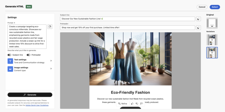Pour étendre la personnalisation au-delà des campagnes basées sur les audiences, les responsables marketing doivent créer du contenu qui trouve un écho auprès d’une clientèle spécifique. C’est là que l’IA générative entre en jeu. L’Assistant IA pour la génération de contenu de Journey Optimizer vous permet de créer rapidement du contenu et des variations de messages. Vous pouvez les générer à partir des différents composants d’un e-mail (ligne d’objet, texte d’aperçu, corps du message, images, etc.), soit individuellement, soit dans des templates présélectionnés. Élargissez votre champ d’action pour concevoir des e-mails fidèles à l’identité de la marque, qui intègrent votre contexte, votre contenu et votre charte graphique. Faites ensuite des essais pour déterminer les meilleures variantes d’e-mail en fonction de vos objectifs, puis développez les versions retenues sans interrompre vos programmes d’e-mailing en cours.