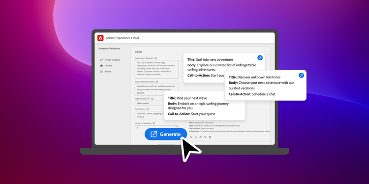 Or, en recourant à la génération de variantes dans Experience Manager Sites, les spécialistes marketing peuvent échapper à ces tâches manuelles : il leur suffit d’entrer quelques éléments d’information dans l’outil dédié, optimisé par l’IA. Ce dernier leur recommande alors plusieurs bannières attrayantes, tout en leur permettant d’apporter des modifications mineures à la version optimale retenue.