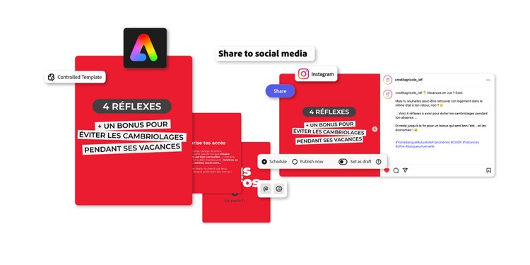 Pour garantir la cohérence de la marque, le Crédit Agricole d’Ile-de-France a collaboré avec l’agence de design Les Jumelles pour créer une bibliothèque de plus de 30 modèles Adobe Express. Ces modèles, parfaitement respectueux de l’identité visuelle de la banque, sont verrouillés pour empêcher toute modification non autorisée des éléments fondateurs de la marque. Les membres de l’équipe peuvent uniquement modifier le texte et les images, ce qui permet à tout collaborateur de produire des visuels de qualité sans commettre d’impairs vis-à-vis de la charte graphique.