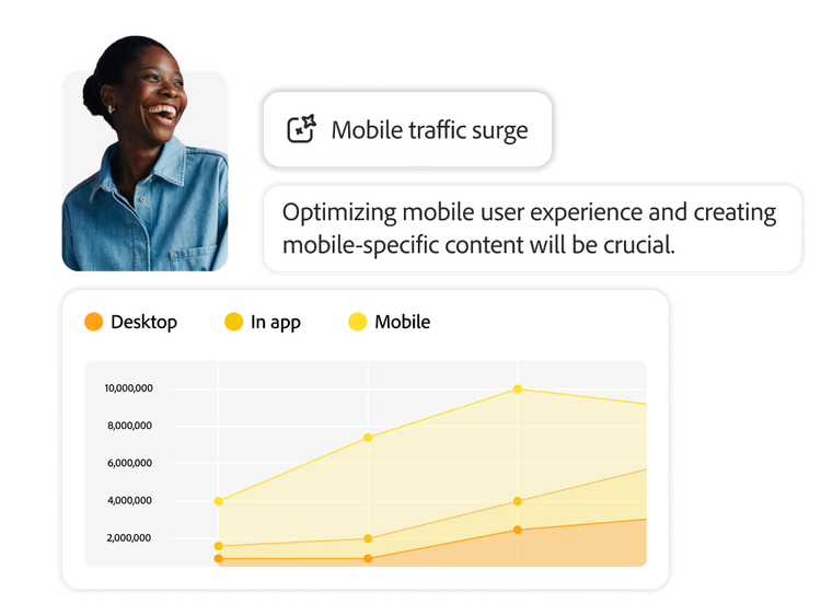 Améliorez l’expérience client et optimisez les assets en mesurant les performances clés de votre contenu et en identifiant des tendances à l’aide de l’IA avec Adobe Content Analytics.