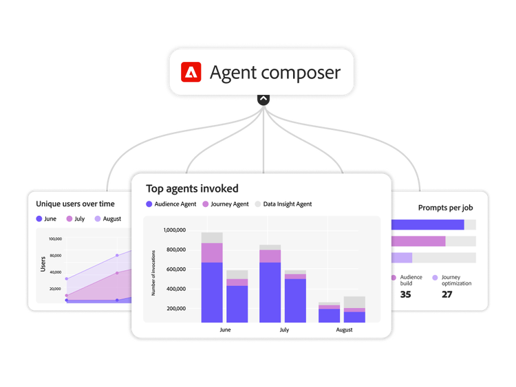Obtenez une vue centralisée de l’utilisation des agents Adobe Experience Platform par votre organisation. Agent Composer facilite le suivi des métriques de conversation, des modèles d’usage et de la consommation de crédits pour les équipes, afin de comprendre l’impact des agents et d’en accroître l’adoption dans toute votre organisation.