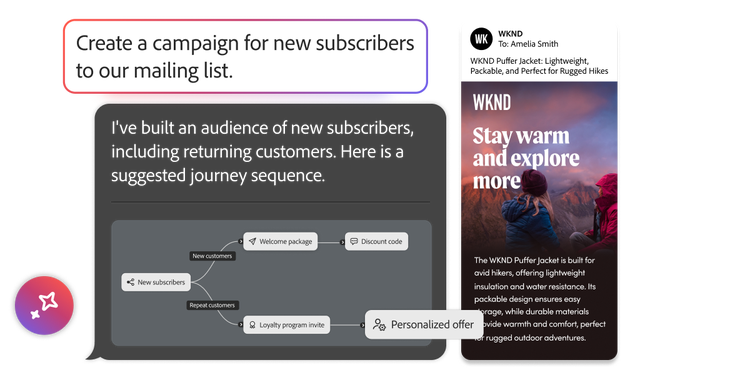 Donnez à vos équipes les moyens de créer des campagnes percutantes plus rapidement que jamais. En quelques minutes, affinez vos objectifs, analysez vos données, ciblez vos audiences, planifiez vos parcours e-mail et générez des variations de contenu.
