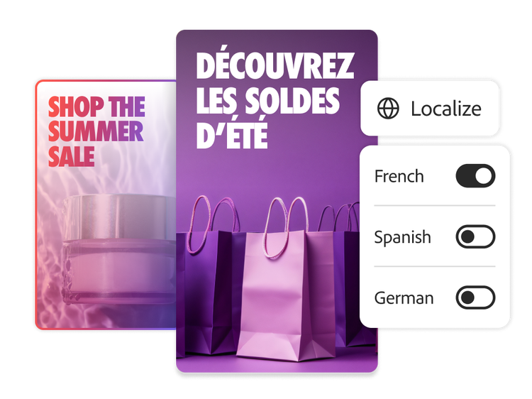 - Accélérez la diffusion omnicanal. Adaptez facilement le contenu existant approuvé par la marque à n’importe quel canal grâce aux outils d’IA générative d’Adobe.