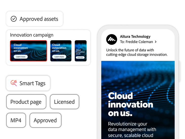 眾多利害關係人——包括行銷、創意、銷售、產品、客戶服務團隊,以及合作夥伴、經銷商和代理機構——都需要迅速獲取已獲核准且符合品牌標準的即用內容。Adobe 為高科技企業提供了一個集中式內容需求解決方案,確保您的資產庫能夠讓團隊、合作夥伴和各地區輕鬆存取和搜尋。