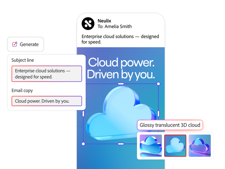 - Genera testi per e-mail, oggetti e immagini basate su Firefly, senza mai uscire da Marketo Engage.