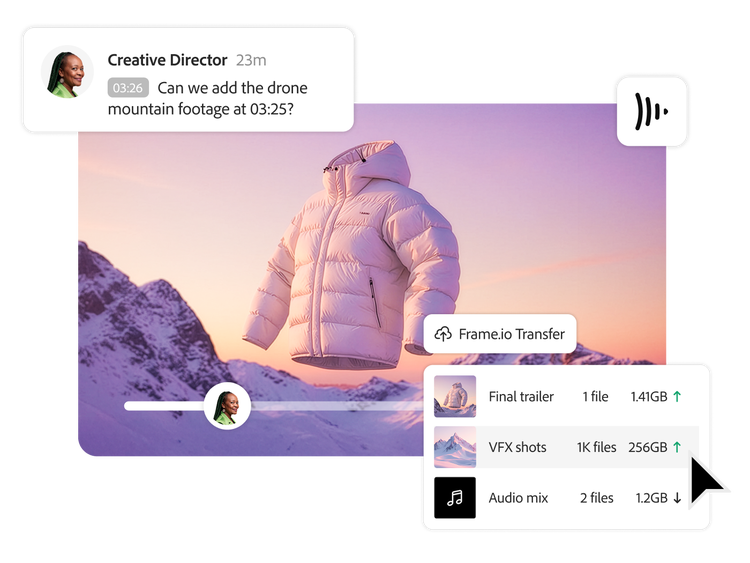 - Lavoro creativo in corso semplificato. Usa Workfront, Frame.io e Adobe Creative Cloud su un livello di archiviazione condiviso, eliminando le noise operazioni di caricamento e download delle risorse. Goditi un project management fluido, revisione in tempo reale e collaborazione senza sforzo in un unico flusso di lavoro end-to-end.