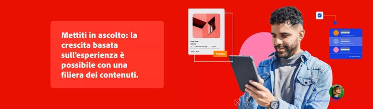 Scopri come Experience Manager Sites, Experience Manager Assets, Workfront e Creative Cloud permettono di creare una filiera dei contenuti efficace e capace di raggiungere risultati aziendali misurabili, collegando persone, processi e tecnologia per garantire il successo della customer experience su larga scala.