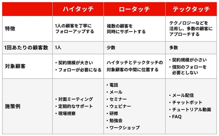なお、ハイタッチで発見された課題を長期的にフォローする場合は、少ないリソースで効率よく対応するために、ロータッチやテックタッチ向けのアプローチ方法を適用することが一般的です。