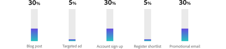 先ほどの旅行会社の例を用いて説明します。W型マルチタッチアトリビューションモデルでは、ブログ記事、顧客によるアカウントの作成を促進した2度目のサイト訪問とwebページ上の機能、およびプロモーションメールに対してコンバージョンの貢献度を割り当てます。コンバージョン率の向上につながるこれらの3つの接点に重点を置くことで、より全体的にバランスの取れたマーケティング戦略を推進できます。