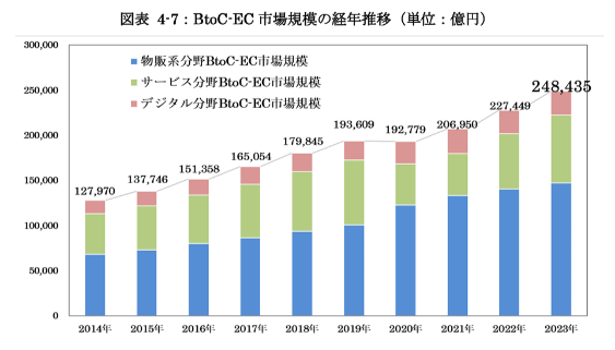 経済産業省の資料によると、2023年における国内のBtoC-EC市場規模は、24兆8435億円です。2014年の12兆7970億円に比べると、市場が2倍近く拡大しています。