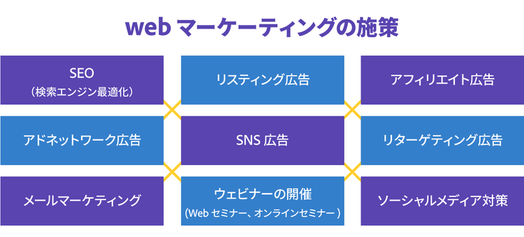 Webマーケティングの集客施策として、SEOやSNS広告、webサイト運用など様々な施策が挙げられます。また、マーケティング活動を成功させるには、フェーズごとに施策を使い分けたり、ツールを活用したりすることが重要です。