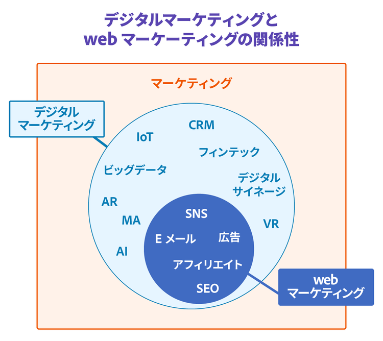 一方、webマーケティングが対象としているのは、あくまでwebを利用するものに限られています。つまり、webマーケティングはデジタルマーケティングの一部といえるでしょう。