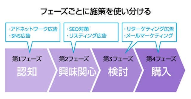 動画は静止画に比べて、ユーザーの興味関心を引きやすいので、BtoC、BtoBであるかを問わず、取り組んでいる企業が増えています。この施策に取り組む際は、ユーザーの購買フェーズに合わせて動画の内容を決めることが重要です。