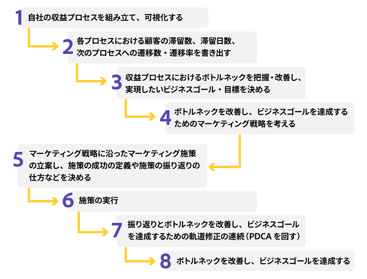 マーケティング施策を実施し、PDCAを回していく際は、以下のような8つの手順で行うのが一般的です。