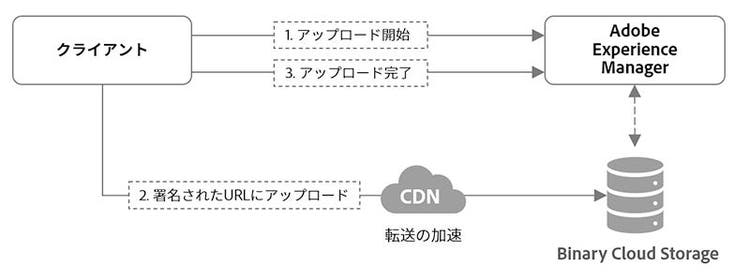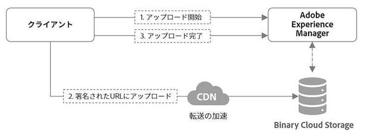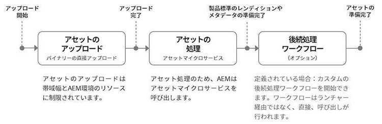 - ユーザーはアセットをクラウドストレージにアップロードし、アップロードを確認するメッセージをAEMに送信します。