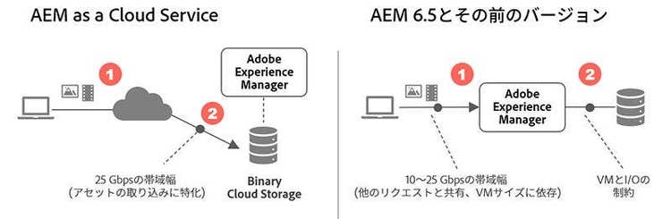 これはオンプレミス版やAdobe Managed Services版のAEMを大幅に改善したものとなっています。この図はAEM as a Cloud Serviceのアセット処理をAEM6.5およびその前のバージョンと比較したものです。