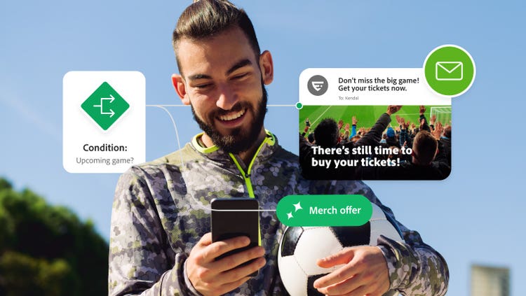 1つ目のジャーニーフローでは、次の試合に関するニュースレターを顧客に配信します。顧客がチームショップを通過し、別のジオフェンスに入ると、リアルタイムのモバイルプッシュによる商品オファーがトリガーされます。これは、試合が始まる前に、顧客にチームの公式グッズを購入するように促すのに最適なタイミングです。
