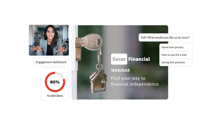 - Adobe Marketo Engage内でライブウェビナーセッションを作成、開催し、リアルタイムの投票、アンケート、チャット、Q&A、挙手機能などで参加者の関与を促し、登録や出席データ以上のものを収集できます。