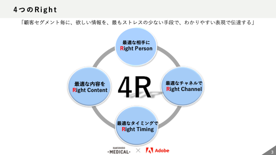 コンテンツPDCAを実施する目的のひとつは、“4つのR”、すなわち、Right Person, Right Channel, Right Timing, Right Contentを実現することです。顧客セグメントごとに、欲しい情報を、最もストレスの少ない手段で、わかりやすい表現で伝達します。そのために、ニーズの把握、ストーリー設計・コンテンツ制作、解析、という順番でプロセスを回します。