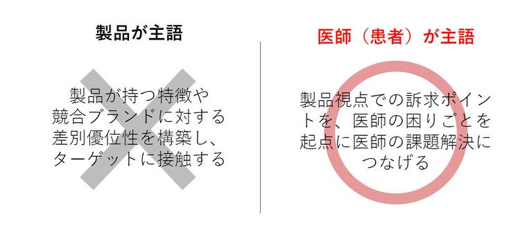 具体的には、医師や患者が抱えている課題を提示して共感を醸成する。その上で課題を解決するための方法としての製品、どのように解決するのかのエビデンスを示す。最後は課題が克服された状態までを描きクロージングする。大きくは、このようなシナリオです。