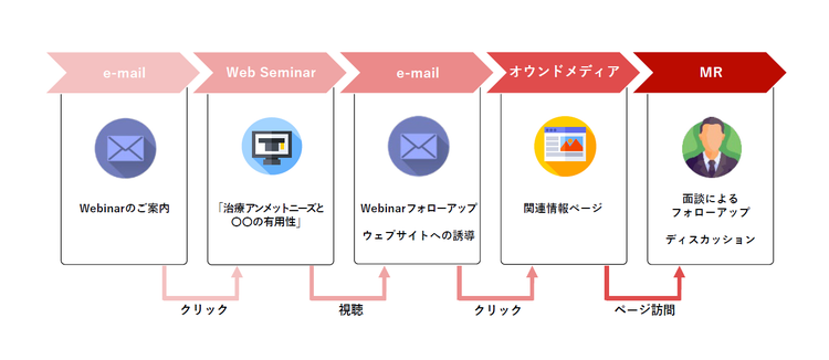 ここで重要なのが、コミュニケーションを単発で終わらせるのではなく、ジャーニーに沿って、全体最適の視点で設計することです。メールでWeb Seminarを案内する。参加した医師にはMRがフォローを行い、オウンドメディアに掲載されている関連コンテンツを紹介するなど、連続性を持ったアプローチを検討するなど、連続性を持ったアプローチによって、コミュニケーションからの離脱を防ぎ、最終的な処方獲得のためのハードルを取り除きます。