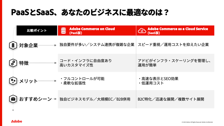 この中では、「標準機能を活用して、スモールスタートでECサイトを立ち上げられる」「単一のEC基盤でB2C/B2B/B2B2X、すべてのビジネスモデルに対応できる」といったAdobe Commerceの特長に加え、新たに提供開始となったSaaS版の「Adobe Commerce as a Cloud Service」についても共有。また、既存のバックエンドシステムを残したまま、フロントエンドで最新のパフォーマンスを実現できる「Adobe Commerce Optimizer」のリリースについても言及がありました。