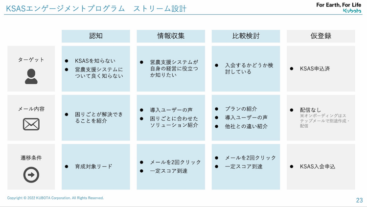 当時、この「KSAS」には大きな課題があったと言います。「KSAS」はwebから利用者自身が申し込み、クボタと直接取引するサービスだったため、日頃、主力製品を取り扱っているセールススタッフの契約者拡大活動がどうしても後回しになりがちだったのです。「そこで『KSAS』の入会前から入会後までをAdobe Marketo Engageでサポートすることにした」と語る同社 農機国内営業部 KSAS推進課の柚山奈々氏。「カスタマージャーニーを作成し、それぞれの状態のときにお客様がどういった悩みがあるのかを想定しました。そこに対してどのような情報をお届けすればお役に立てるのかを考え、エンゲージメントプログラムに落とし込みました」。