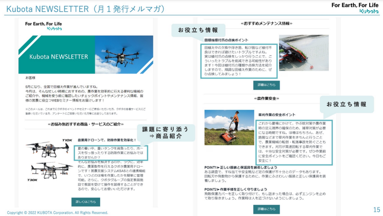 開封者のうちのクリック率は平均約16%。農家の方からは「メンテナンスや農作業安全など、役立つ情報が多いから毎回読んでいる」といった喜びの声が届いているそうです。