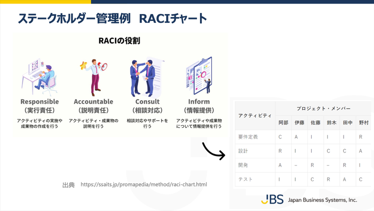 三田村氏は、「特に正解はないけれど、大切なのは『ステークホルダー登録簿』としてドキュメントで残して可視化すること。プロジェクトのキックオフで『ステークホルダーは、こちらで合っていますか?』と確認するのが重要です」と語り、オススメの管理法として「RACIチャート」を紹介しました。