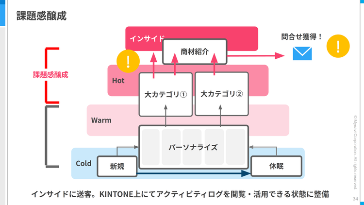 このメールをもって、顧客が自発的に問い合わせをしてくれるケースもありますが、もし動きがなければ、ここでインサイドセールス部門へ情報を引き継ぐとのこと。Adobe Marketo Engageから、岸氏らの部門でCRMとして利用しているkintoneへ、顧客の細かな行動も含めたログが自動出力/反映される体制が、すでに整えられているそうです。