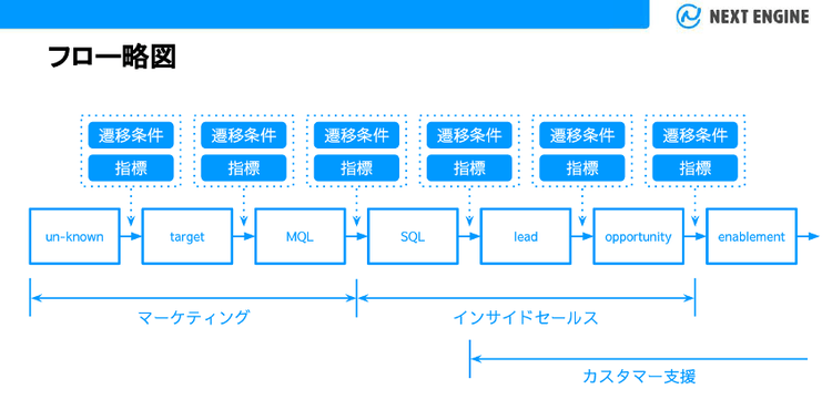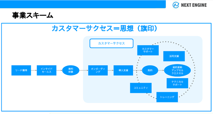 ECサイト運営業務を効率化・自動化するSaaS型のB2Bシステム「NEXT ENGINE」の顧客育成にMarketo Engageを活用している同社。一般的なSaaS型サービスの事業スキームとは少し異なり、無料体験後にオンボーディング・導入支援・契約・契約更新/アップセル/クロスセルへと進んでいく流れになっています。したがって、以下の図のように、カスタマーサクセスの概念も、一般的なものより広く捉えていると言います。