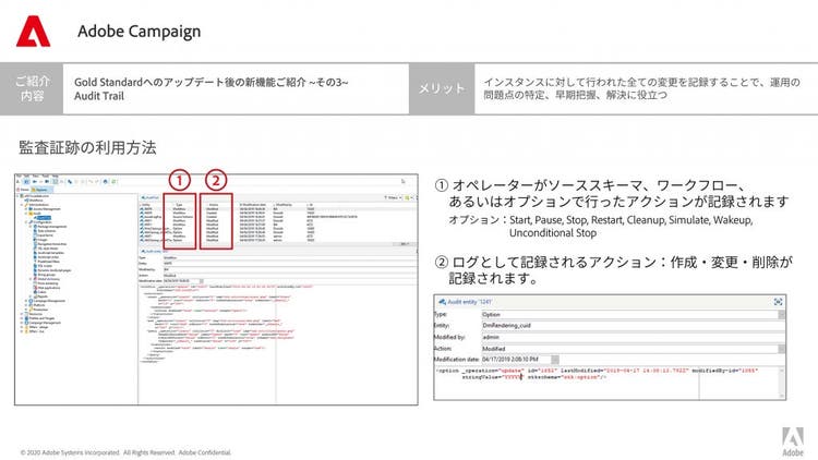Adobe Campaign Gold Standardへのアップデート後に追加・強化される新機能のうち、Google reCAPTCHAについて紹介します。これは、監査記録機能とCSRF対策としての機能になります。監査記録機能はインスタンスに対して行われた全ての変更を記録することで、運用の問題点の特定、早期把握、解決に役立ちます。