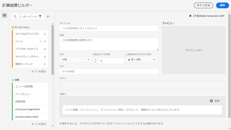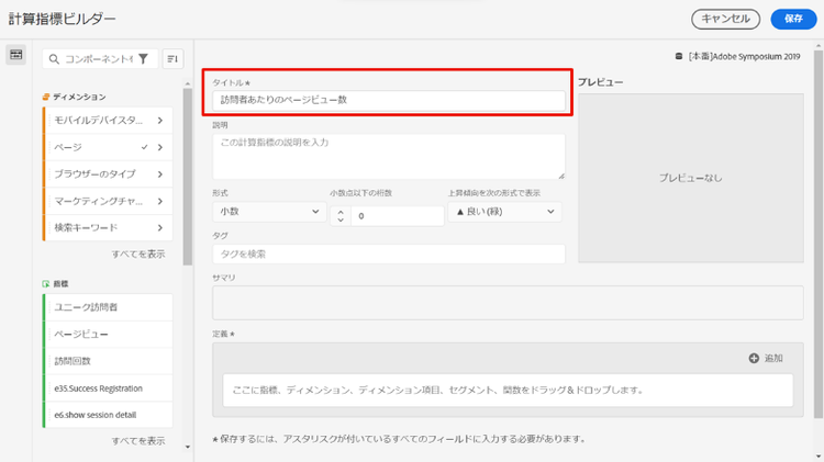 計算指標ビルダーを使って実際に計算指標を作成してみましょう。今回は、『ページビュー』『ユニーク訪問者』という二つの指標を使用し、『訪問者当たりのページビュー』という計算指標を作成します。