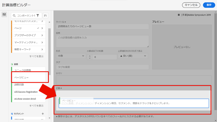 計算指標の定義を作成します。セグメント作成時と同様、作成に使用する指標をコンポーネントエリアからドラッグ&ドロップで「ここに指標、ディメンション….をドロップします」という表示のあるエリアに持っていきます。この例では、まず『ページビュー』の指標を適用させます。