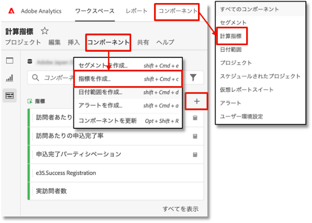 方法②:プロジェクトメニューの『コンポーネント』⇒『計算指標の作成』を選択