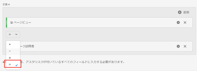 そのタイミングでドロップすると、『ページビュー』の下に『ユニーク訪問者』を新たに追加することができます。追加後、二つの指標の間に演算子を選択できるドロップダウンボックスが表示されますので、この例では『÷』を選択します (『訪問者当たりのページビュー数』=『ページビュー』÷『ユニーク訪問者』)。