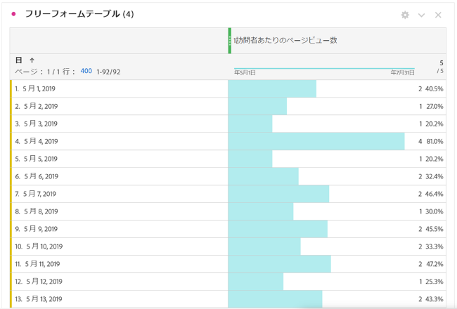 ユニーク訪問者1人当たりの訪問回数。『訪問回数』÷『ユニーク訪問者』で作成可能。